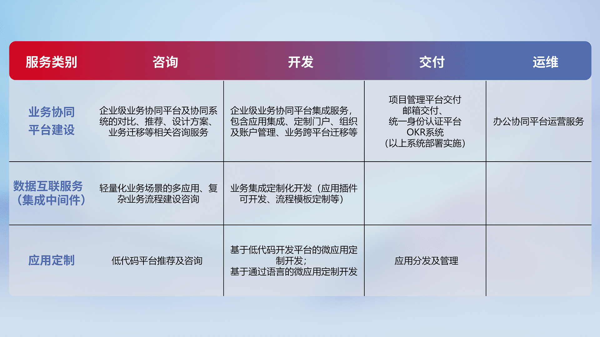 针对钉钉、、企微、、IDaas等平台级产品提供产品的规划、、、方案、、、交付、、定制化开发等服务,,,实现如统一协同办公、、、、智能客户服务、、混合会议管理、、、、智能数据查询、、、、等业务场景,,,,实现数字化转型。。