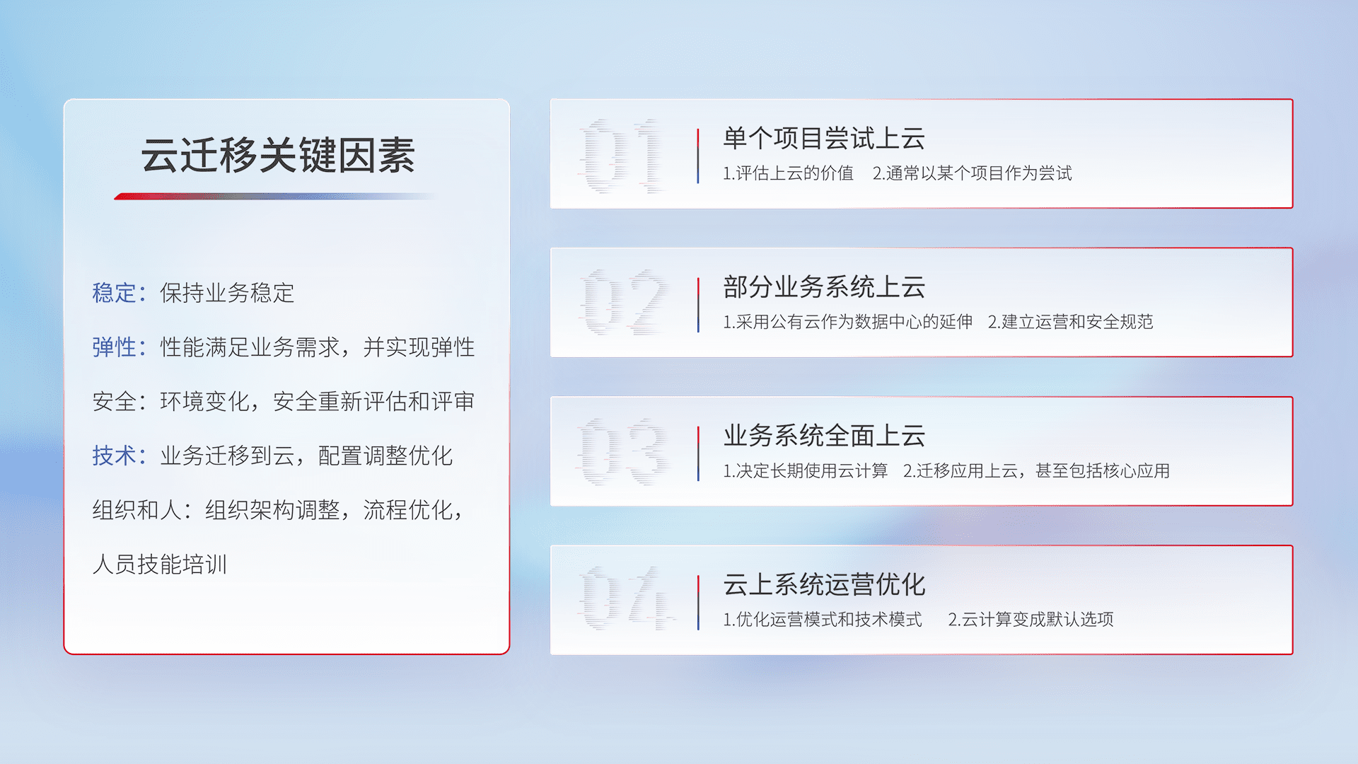 结合实际业务,,,,从规划设计、、、云平台选型、、、云原生改造、、数据迁移、、、集成交付,,,迁移全过程为客户识别最佳上云路径,,,做好风险识别管理,,,,设计网络架构、、、身份权限、、、、安全审计合规、、、操作审计、、、、日志审计、、监控告警策略、、多站点容灾设计等,,,对云上基础设施进行整体规划,,提升IT治理水平,,以满足弹性、、高可用、、、、高性能的需求。。