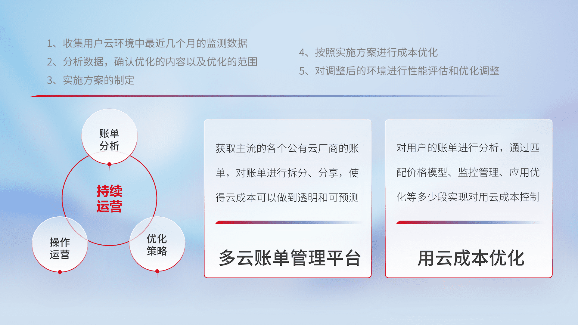 通过多云纳管,,以统一的资源数据模型把客户的云资源进行抽象和封装,,进而实现对多云资源的统一操作,,,,保障云资源管理的可靠性、、稳定性与可用性。。量身定制化运维内容,,配置、、、、开发运维、、、补丁管理、、备份、、监控、、、认证和访问管理、、、、审计和日常巡检等,,保障在用云过程中的可靠度,,,稳定度以及高可用率。。。。